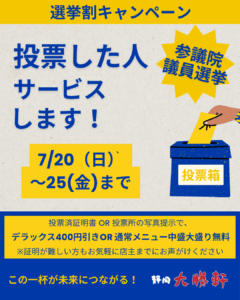 - 選挙割、今回も実施します!|7月20日(土)~25日(木)限定